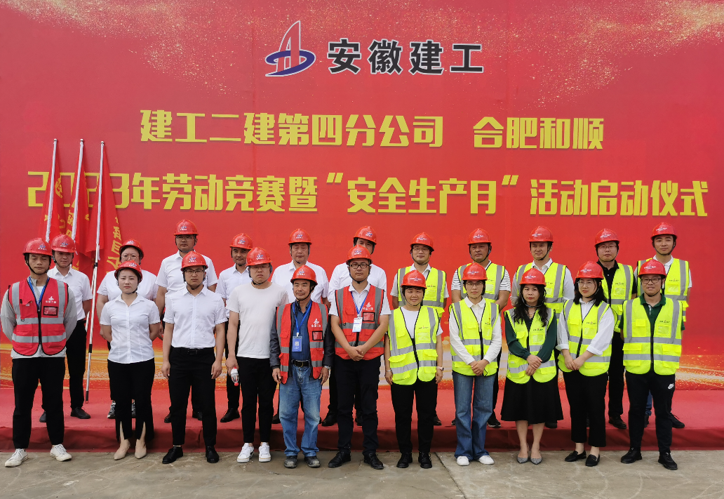本次勞動競賽旨在充分調動廣大建設者的積極性,引導廣大職工充分發揮勞模精神、勞動精神、工匠精神,安全、優質、高效地圓滿完成施工任務?;顒蝇F場,第四分公司生產副經理周文建作動員講話,合肥和順總經理沈印、越秀地產項目總經理董大澤分別發言,第四分公司質量副經理劉韌宣讀2023年勞動競賽實施方案,參賽項目代表付奎表態發言,參加活動的領導為各參賽項目授旗。