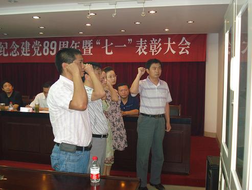 新黨員在表彰大會上進行入黨宣誓