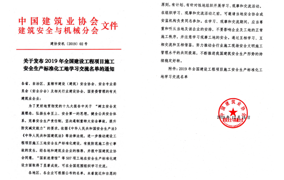 2019年,公司共創建全國建設工程項目施工安全生產標準化工地1個,省級安全生產標準化示范工地8個,市級安全生產標準化示范工地8個,集團公司安全文明標準化示范工地10個,創建項目數量再創歷史新高,突破了6年來國家級示范工地及省外項目省級示范工地零的突破。