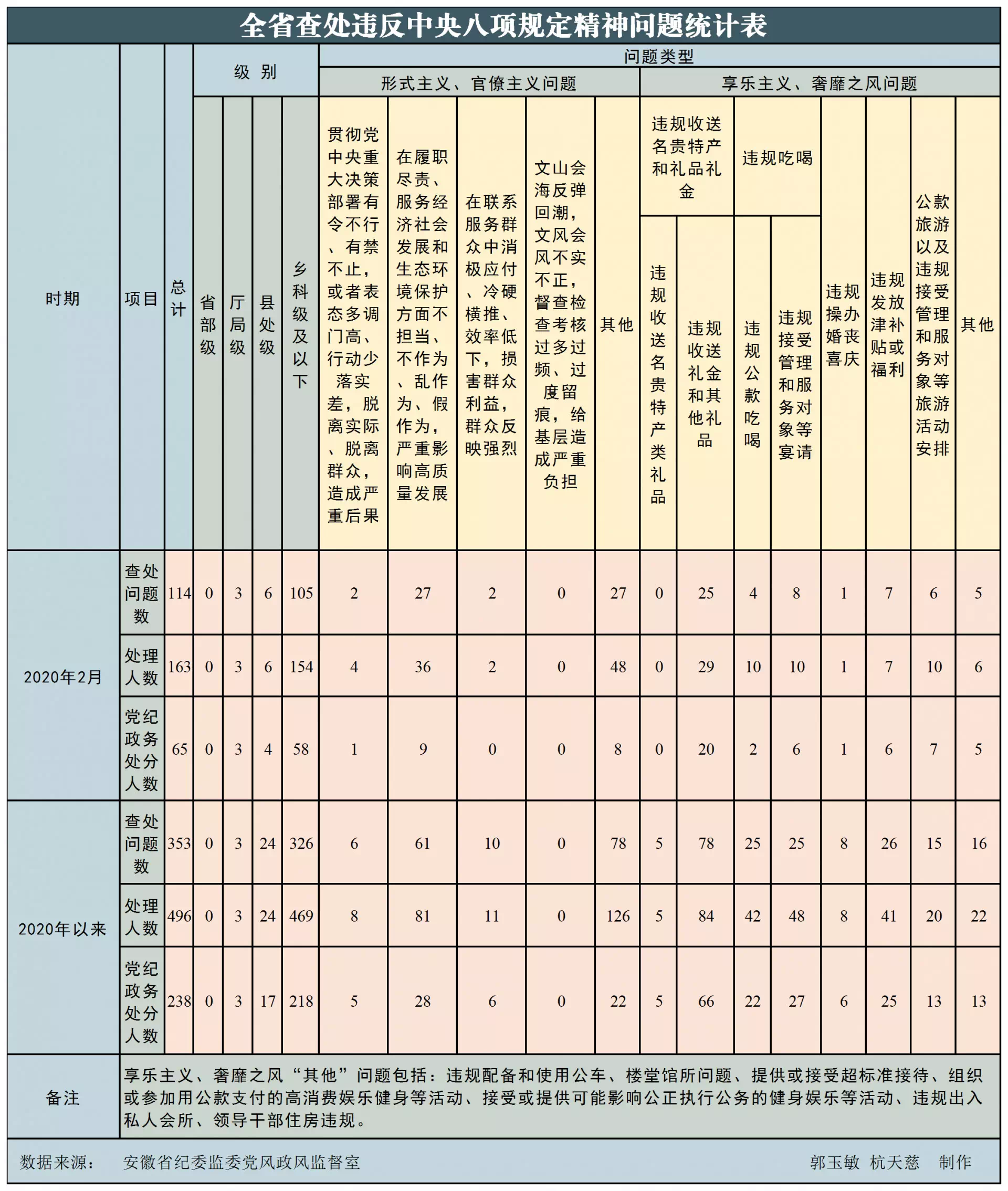 為掌握全省貫徹落實中央八項規定精神情況,安徽省紀委監委在各省轄市和各省直機關、各省屬高校、各省屬企業建立了落實中央八項規定精神情況月報制度。2020年以來,截至2月29日,全省查處違反中央八項規定精神問題情況如下: