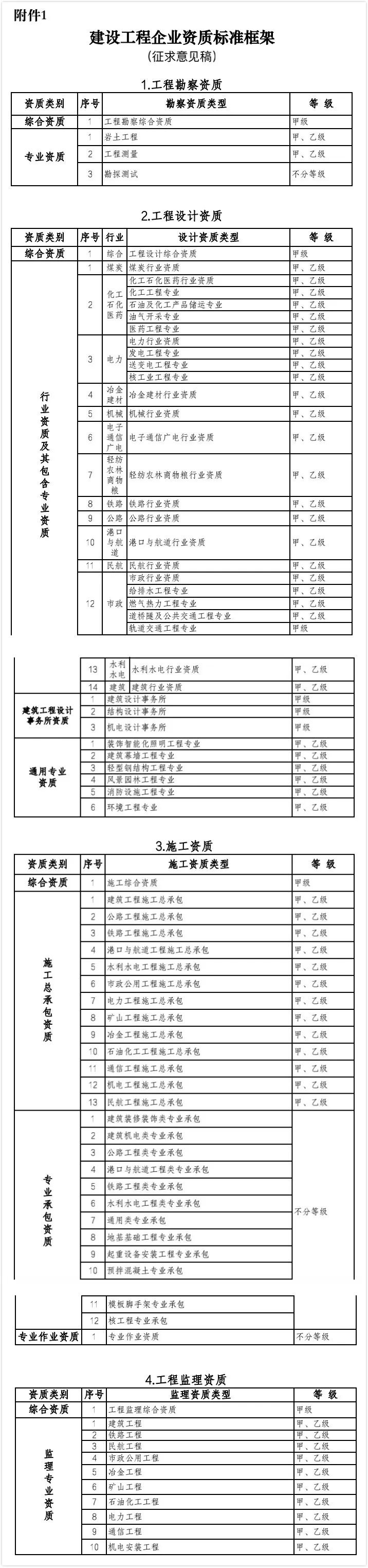 《建設工程企業(yè)資質(zhì)標準框架(征求意見稿)》全文如下: