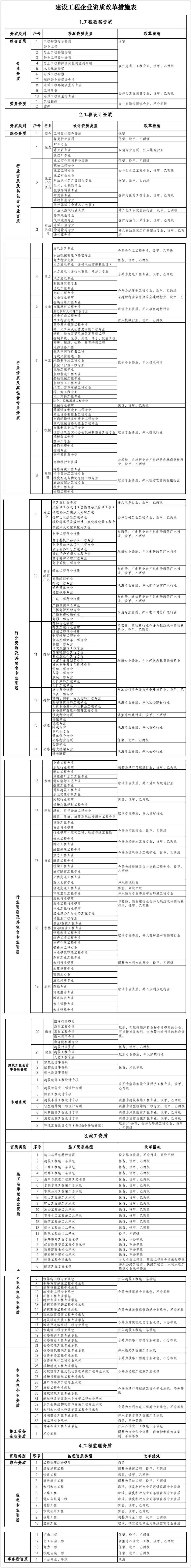 (二)工程設計資質(zhì)。保留綜合資質(zhì)。對部分行業(yè)資質(zhì)進行整合,其中,冶金行業(yè)與建材行業(yè)合并為冶金建材行業(yè)資質(zhì),輕紡行業(yè)、農(nóng)林行業(yè)、商物糧行業(yè)合并為輕紡農(nóng)林商物糧行業(yè),電子行業(yè)、通信行業(yè)、廣電行業(yè)合并為電子通信廣電行業(yè),石油天然氣行業(yè)并入化工石化醫(yī)藥行業(yè),軍工行業(yè)并入機械行業(yè),核工業(yè)行業(yè)并入電力行業(yè),資質(zhì)等級壓減為甲、乙兩級,原丙級資質(zhì)并入相應行業(yè)乙級資質(zhì)。取消海洋行業(yè)及專業(yè)資質(zhì),相關(guān)企業(yè)可以換發(fā)相近行業(yè)資質(zhì)。整合原化工石化醫(yī)藥、石油天然氣、電力、市政行業(yè)中的專業(yè)資質(zhì),資質(zhì)等級壓減為甲、乙兩級,原丙級資質(zhì)并入相應專業(yè)乙級資質(zhì);取消其他行業(yè)的專業(yè)資質(zhì),并入相應行業(yè)資質(zhì),原甲、乙級專業(yè)資質(zhì)并入相應等級的行業(yè)資質(zhì),原丙級專業(yè)資質(zhì)并入乙級行業(yè)資質(zhì)。將專項資質(zhì)調(diào)整為通用專業(yè)資質(zhì),取消環(huán)境工程專項資質(zhì)的5個專項類別,整合為環(huán)境工程專業(yè)資質(zhì),資質(zhì)等級壓減為甲、乙兩級,原丙級資質(zhì)并入相應專業(yè)乙級資質(zhì)。保留3類事務所資質(zhì)。