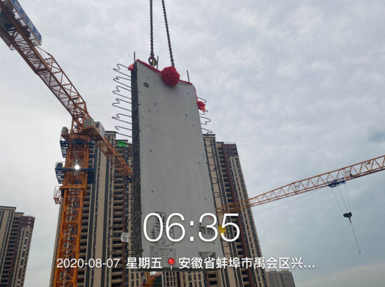 2020年8月7日,首批預制裝配式豎向構件順利到達蚌埠山香安置房項目現場。項目管理人員對吊裝前準備工作進行排查,確認無誤,隨著“起吊”一聲令下,塔吊緩緩將首塊墻板提升,整個起吊和安裝過程便捷順利,且安裝后平整度、垂直度均達到預期效果。項目技術人員對吊裝全過程及時記錄,為公司后續裝配式建筑的建造提供了第一手詳細數據。