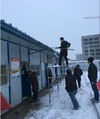 大伙兒冒著寒風,紛紛拿著鐵鍬、掃帚等打掃工具趕赴掃雪現場,相互配合、齊心協力,你鏟我掃,一點點地將積雪鏟起集中堆放,一派熱火朝天的景象。經過一個多小時的奮戰,項目部施工現場主要通道和項目部院子、生活區等地的積雪全部鏟除,看著清理干凈的路面,大家洋溢著開心的笑容。
