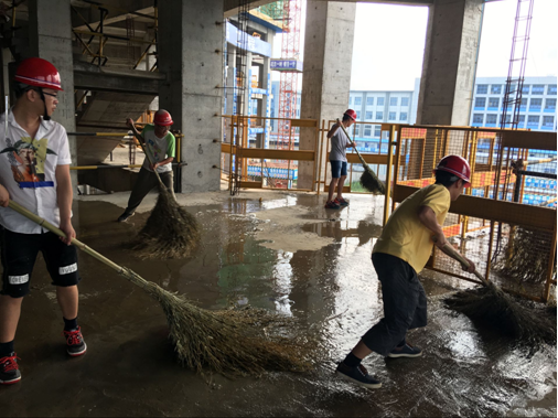 團員青年利用傍晚高溫天氣減弱時段,使用大掃帚、灑水管、拖把、防塵布等物品,在工地安全入口、樓層內、施工環形路上進行除塵行動,每一名青年團員滿懷熱情,積極響應,你灑水我拖地,你接水管我蓋布,干勁十足,展現了生物島一期項目青年團員的良好形象。