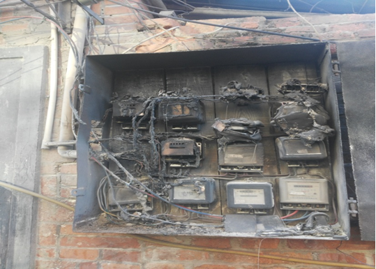 7月21日清晨5點,后勤綜合服務部物管辦接到原二分公司生活基地管理員緊急電話,生活區平3棟電表箱因持續高溫用電負荷增大,線路老化嚴重造成電表自燃,表箱整體燒毀。由于消防器材的配備完善,平時對居民防火意識的宣傳到位,撲救及時,未造成重大火災及財產損失。接到電話后,后勤物管辦立即安排專業技術人員趕赴現場,對事故現場進行全面的排查檢修,在不影響整個小區居民正常用電的情況下,首先斷開這一棟平房主電源解除安全隱患,在本著以最快速度解決問題和節約成本的前提下,對現場進行了梳理,就地制定解決施工方案并及時匯報領導實施操作。