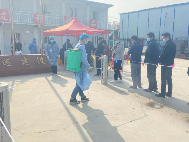 宿遷市進入4月份以來疫情較為嚴重,自4月1日起,全市分區域進行封控、管控,上級政府部門要求施工單位積極配合協助開展防疫工作。疫情就是命令,接到任務后,項目經理劉闖立即召開防疫工作會議,全面落實各項疫情防控措施。設置單獨的隔離觀察室,用于需臨時隔離觀察的人員單獨生活居住;準備口罩、測溫計、消毒液等防疫物資;排查兩周內往來史、接觸史,杜絕疫情的輸入性、擴散性蔓延;對所有進出施工區、辦公區、生活區人員進行實名制登記和現場消毒殺菌;嚴格落實施工工地封閉管理,全面管控人員出入工地,無關人員不得進入工地,項目部人員停止休假、探親和聚集活動。除此之外,3月26日起,政府在項目部設置了核酸檢測站點,目前已連續進行了19次核酸檢測,包括附近工地和居民,每天約一千人,工作量極大。項目部志愿者積極配合現場防疫工作,對每個進入現場的人員進行掃碼、登記、測量體溫,為打贏疫情防控阻擊戰貢獻國企力量。