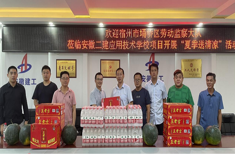 烈日炎炎,酷暑難當(dāng),為確保一線工人身心健康,督促做好夏季高溫期間安全生產(chǎn)工作,7月15日上午,宿州埇橋區(qū)勞動監(jiān)察大隊(duì)黨支部書記、副大隊(duì)長王建一行赴安徽二建宿州應(yīng)用技術(shù)學(xué)校項(xiàng)目開展“夏季送清涼”活動,為奮戰(zhàn)在高溫下的建筑工人送來了真摯的問候和關(guān)懷。