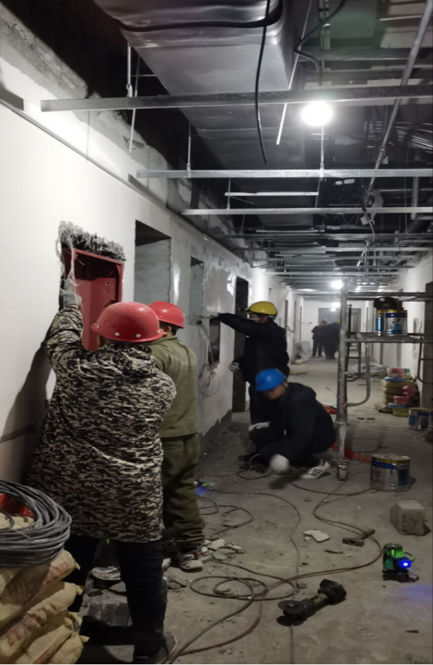 自11月底接到肥東縣委縣政府主要領導指示,公共衛生綜合樓須提前交付,投入疫情防控使用。根據公司搶工動員大會精神,第二分公司、項目部迅速行動起來,分公司領導親自指揮,全員行動,火速調配勞動力、材料物資、機械設備等資源力量,投入搶工戰役。一天之內,編排好詳細的搶工倒排施工計劃、實施方案、保證措施,同時成立各作戰小組,確保各項任務如期完成。截止目前,外立面裝飾已完成,除五樓由院方負責外,各樓層水電消防橋架暖通空調智能化等穿線、管道設備安裝已全部完成,裝飾裝修進入到攻堅階段。地墻面磚已鋪貼完畢,油漆涂料正在收尾。病房內吊頂正在安裝,墻面冰火板已安裝鋪貼50%,pvc地板自流平地坪已完成澆筑,室外道排已完成一半,正在全力沖刺最后目標。在搶工同時,質量和安全也毫不放松,確保“黃山杯”創建,優化工藝,提升質量標準。安全檢查日查日報,及時消除隱患。
